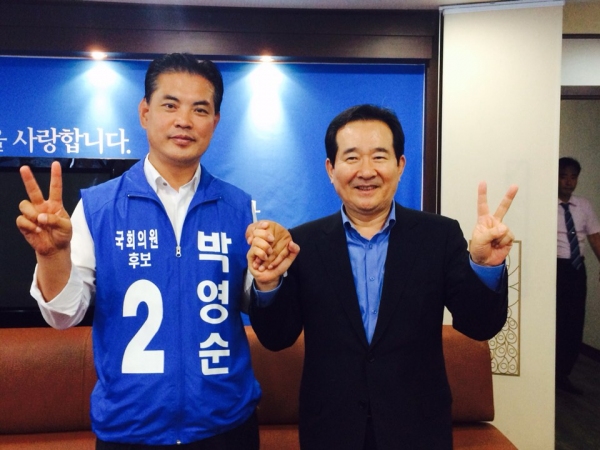 새정치민주연합 정세균(오른쪽) 상임고문이 지난 18일 대전 대덕구 오정동 박영순 후보 선거사무소를 찾아 7·30 국회의원 보궐선거에 나선 박 후보의 필승을 기원하며 손을 맞잡고 있다. 박영순 후보 제공