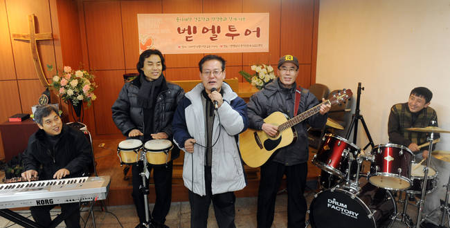 ◆노숙인 출신 밴드 '도개걸윷모'인생은 굴곡이 있기 마련이다. 달갑잖지만 좌절과 시련은 약방의 감초마냥 우리 삶을 개입한다. 발버둥 쳐도 수렁에 덜미를 잡힌 몸뚱이는 좀처럼 헤어 나오지 못한다. 그러다 체념해버리면 재기는 물거품이 될 수 밖에 없다. 지난날 아린 상처를 딛고 자존감을 되찾아 가는 이들이 있다. 이제 소박하나마 잊혀진 꿈을 주섬주섬 집는다. 음악으로 희망과 용기 바이러스를 전파 중인 노숙인 출신 밴드, 도개걸윷모 기교나 세련미를 찾기에는 아직 그들의 음악은 거칠다. 그러나 느낌이 살아있다. 산다는 것에 대한 질퍽한 무엇처럼 폐부에 감기는 그네들의 이야기를 들어봤다.#1. 윷놀이 판을 깔다"윷가락 4개는 땅을, 도, 개, 걸, 윷, 모는 하늘을 뜻하며 각기 다른 부족을 상징합니다. 윷가락 4개는 벧엘의 집 부설기관인 '쉼터', '희망진료센터', '희망지원센터', '사회적기업 야베스공동체'를, 도개걸윷모는 고향도 이름도 다른 우리가 우정과 사랑을 나누며 벧엘의 집 지붕아래 함께 살고 있음을 표현하고자 했습니다.도개걸윷모를 이끌고 있는 원용호 단장(사회적기업 야베스공동체대표)의 설명이다. 봉고와 노래를 담당하는 원 단장은 벼랑 끝에서 한뎃잠을 자 보지 않은 유일한 사람이다. 다른 멤버들은 천생 마음씨 좋은 이웃집 아저씨 포스다. 기타 솜씨가 예사롭지 않다는 이용주(58) 숯부작 팀장, 베이스와 노래를 맡고 있는 오규율(54) 숯부작 사업·영업 부장, 드럼 김준수(51) 야베스공동체 경영지원 실장, 건반 서동철(48) 세탁사업부 상무가 밴드를 구성하는 5인방이다.사실 밴드는 통기타를 멘 중창단이였다. 2007년 창단했고 다섯이 입 맞춘 건 1년 정도 됐지만 드럼이며 건반 등 악기를 장만한 것이 이제 한 달 남짓이다. 지금은 연주 실력이 걸음마 수준이라는 이실직고 뒤에 너스레웃음이 그래서 터졌다.#2. 눈물젖은 빵에 이별을 고하다원 단장 말마따나 멤버들은 나이도, 고향도 다르다. 노숙인이라는 주홍글씨를 새겨야 했던 사연도 제 각각이다. 공통점이라면 삶의 무게에 짓눌린 크고 작은 흉터를 지니고 있다는 정도다. "천직으로 알고 살았던 전기사업에 실패하고 밑바닥으로 떨어졌습니다.(이 팀장)", "교감으로 명예퇴직 후 인생의 쓴 맛을 보게 됐지요.(오 부장)", "은행원으로 27년을 살다 어찌하여 이 길로 밀렸습니다.(김 실장)", "사업 실패가 원인이었죠.(서 상무)"세월이 약이라고 하나 아물지 않았고 여전히 상기하고 싶지 않은 과거지사를 끄집어내는 게 여간 무안하지 않았다. 그들의 인생 한 자락이 어쩌면 아등바등 살아도 누구나 겪을 수 있는 뒤얽힌 실타래가 아닐까 잠시 상념에 젖었다.더 이상 쓰디 쓴 실패의 잔상에서 허우적거리지 않는다. 단원 모두 '벧엘의 집' 구석구석에서 인생 제 2막을 쓰고 있다. 과부사정 홀아비가 안다고 거리를 헤매는 이들의 속내를 들여다보고 바로 설 수 있도록 보듬는 리더 역을 잘 소화한단다. 넌지시 화제를 꿈으로 돌렸다."재기요. 쉽지 않습니다. 제 나이가 몇인데요. 전기는 전문기술이어서 지금 같은 처지가 아니더라도 2~3년 공백이면 따라가지 못합니다. 현재 생활에 만족합니다.(이 팀장) 희망은 나이 든 사람들에게 사치입니다. 사회구조가 그렇잖습니까. 여의치는 않지만 희망이라는 것을 그려보고 있습니다. 3년 이상 떨어져 지넨 가족을 만나고 싶고, 그렇게 할 겁니다. 특히 80이 넘으신 부모님 생각이 간절합니다.(오 부장) 가족이 뿔뿔이 흩어져 세 집살림을 하고 있습니다. 이제 합쳐야죠.(김 실장) 경제적인 욕심은 없습니다. 지금 생각은 여기(벧엘의 집)에서 죽을 때까지 식구들하고 함께 살면서 봉사하고 나누고 싶습니다.(서 상무)"소박하지만 간절한 그네들의 희망이 오롯이 매조지 되기를 기원한다.#3. 은혜롭게 사는 법매주 수요일 찬양예배 무대만 50번 이상 섰다. 부처님 오신 날, 4대강 중지 기도회, 노숙인 추모제 등 외부 초청행사에도 제법 불려 다녔다. 물론 대부분 밴드로서가 아니라 중창단 '도개걸윷모'로다. 개런티라고 해야 지금까지 한 차례 10만 원을 받은 게 고작이지만 결코 중요한 문제가 아니다."전문 음악인이 아닌데 개런티를 운운하는 것 자체가 우스운 일이죠. 상처받고 아픈 이들에게 희망을 주는 것만으로도 충분합니다.(이 팀장) 남에게 보이는 것도 좋지만 나 자신이 밴드를 통해 은혜를 받았습니다. 내가 만족해야 남들이 느끼지 않을까요.(서 상무)"어엿한 밴드로 멋진 무대를 선보일 날이 그리 멀지 않아 보인다. 한 때 대한민국을 대표했던 밴드 '위대한 탄생'의 멤버였고 프로모션을 했던 조성국 사장(동구 가오동 신게동 장어)과 유명 드러머 출신의 지배인이 뒷배를 자처하고 나섰기 때문이다."올 해부터는 일정을 잡아 제대로 연습할 겁니다. 우리도 해 볼만하다고 봐요."평범한 일상에서 깨닫지 못한 게 복지라고 입을 모은다."내 배 불러야 체면치레로 주머니 여는 게 상례 아닙니까. 솔직히 사회 생활할 때는 춥고 배고픈 사람들에게 신경 쓰지 않고 살았습니다. 직접 느껴보니 우리나라 복지 생각보다는 괜찮습디다. 질적으로는 많이 부족하지만요."새 해가 되면 누구나 소망을 말한다. 어