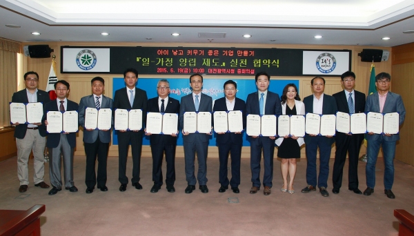 권선택 대전시장은 대전지방고용노동청장, 로쏘㈜ 성심당 등 중소기업 10개 업체 대표들과 함께 지난 19일 오전 10시 시청 중회의실에서 일·가정 양립제도 실천을 위한 업무협약을 체결하고, 저출산 극복을 위해 힘을 모으기로 했다.