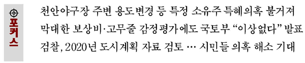 그러나 이 사건은 분명히 검찰이 풀어야 할 차례이고, 사건의 핵심이 천안시의 2020년 도시계획상 야구장을 건립할 자리의 자연녹지를 2종 주거지역으로 지정한 것에 대한 문제를 조사해야 할 것으로 시민들은 기대하고 있다.