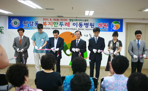 16일 대전 동구 판암동 열림사회서비스센터에서 이종기 정무부시장과 충남대병원 송시헌 원장 등 협력기관 기관장들이 참석한 가운데 복지만두레 이동병원 개원식 행사를 가졌다. 충남대병원 제공