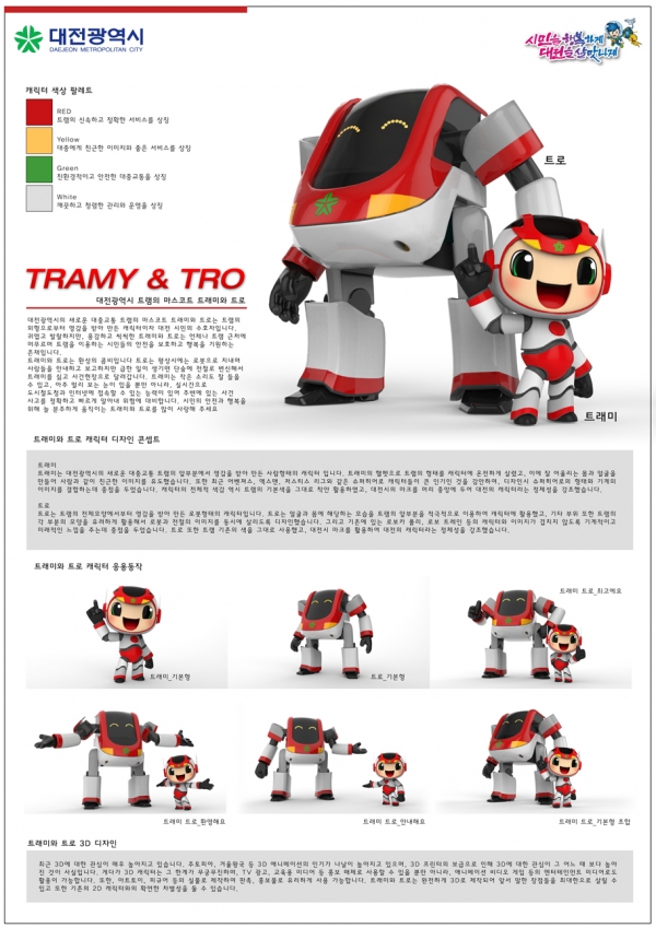 대전트램의 마스코트로 선정된 캐릭터 분야 최우수 작품은 서울에 거주하는 김태호 씨가 출품한 ‘TRAMY & TRO(트래미와 트로)’가 선정됐다. 트램을 형상화한 로봇형태로 귀엽고 발랄하며 용감하고 씩씩한 모습으로 시민의 안전과 행복을 위해 분주하게 움직이는 슈퍼히어로의 의미를 담았으며 4차 산업특별도시의 이미지에도 부합한다는 평을 받았다. 장려상을 받은 대전트램의 약칭 ‘대트’는 대전에 거주하는 강민 씨가 출품한 작품으로 시 마크 색인 녹색을 활용해 친환경 녹색교통수단을 상징하고 날렵한 이미지로 트램이 다른 교통수단에 비해 속도도 빠르다는 의미로 대전에 새로운 활력을 불어 넣어준다는 의미를 담아냈다.