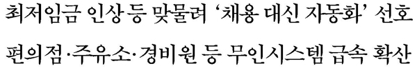 최저임금의 급격한 인상도 이 같은 흐름을 가속화하는 요인으로 꼽힌다. 인건비 부담이 큰 서비스업종의 경우 비싼 임대료, 갑(甲)질 문화 등에 대한 변화가 없는 상태에서 최저임금이 오르다 보니 애써 외면했던 기계·시스템으로 점차 눈을 돌리고 있다. 내년도 최저임금(시급)은 올해보다 16.4%나 오른 7530원으로 결정됐고 정부는 문재인 대통령 임기 내 1만 원을 공약으로 내건 만큼 인건비를 줄이기 위한 자구책 마련에 속도를 내는 형국이다.