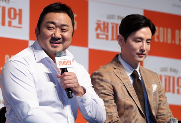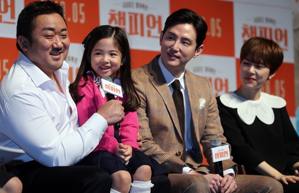 '팔씨름'을 소재로 한 영화 '챔피언'의 제작발표회가 서울 CGV압구정점에서 열려 주연을 맡은 마동석과 권율, 한예리, 아역배우 옥예린과 김용완 감독이 참석, 훈훈한 분위기를 자아내고 있다. <사진=연합뉴스>