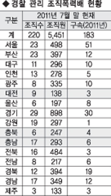 국회 행정안전위 김태원·윤상일 의원이 경찰청으로부터 제출받은 ‘경찰관리 조직폭력배 현황’에 따르면 올 7월말 현재 전국에 220개 조직, 5451명의 조직폭력배가 활동 중인 것으로 나타났다. 1개 조직당 평균 24.7명.