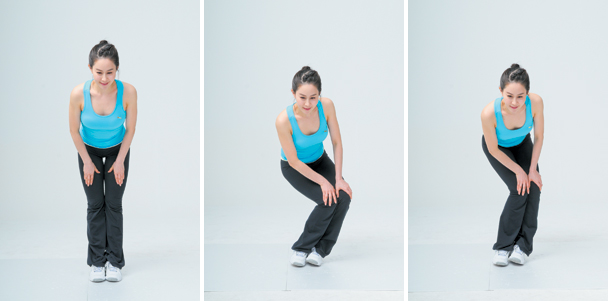 2. 무릎을 잡은 상태에서 좌우로 원을 그리듯이 회전시킨다. 이 동작을 20~30회 되풀이한다.