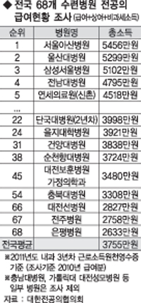 전국적으로 최저 연봉은 서울 소재 은평병원의 2633만 원이다. 이는 서울아산병원의 절반에도 못미치는 액수다.