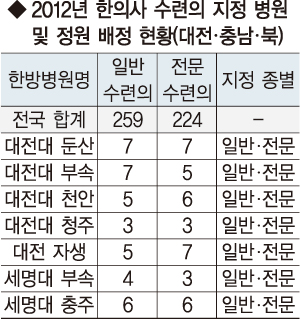 대전·충남·북에서는 대전대 부속 대전한방병원 12명(일반7명+전문5명)을 포함, 둔산,천안,청주 등 대전대 소속 4개 한방병원에 43명, 대전자생한방병원 12명(일반5명+전문7명), 세명대 충주한방병원 12명(일반 6명+전문6명) 등 7개 병원에 74명의 수련의가 배정됐다.