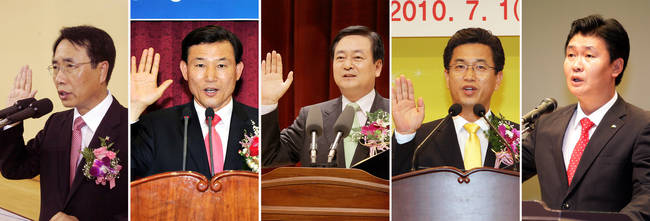 대전 5개 구청장들이 1일 일제히 취임식을 갖고 민선5기의 힘찬 첫 발을 내딛었다.한현택 동구청장은 이날 인동생활체육관에서 각계각층 인사 600여 명이 참석한 가운데 취임식을 가졌다.구는 한 구청장의 뜻에 따라 축하화환과 화분을 받지 않고 행사 현수막을 최소화 하는 등 행사를 검소하게 치렀다.한 구청장은 "전통시장 활성화를 통한 경제적 기반을 만들고, 나눔과 정이 넘치는 따뜻한 공동체를 구현해 내일이 더 행복한 동구를 만들겠다"고 포부를 밝혔다.박용갑 중구청장은 권선택 국회의원, 주민 등 300여 명이 참석한 가운데 취임식을 했다.취임 첫날 관용차 대신 주민이 운전하는 차로 출근한 박 청장은 "재개발 사업 및 사무실형 기업과 연구중심의 기업유치를 통해 활기찬 경제를 이룩하고, 원도심을 생동감 넘치는 젊은 도시로 바꾸겠다"고 다짐했다.박환용 서구청장은 구청 대강당에서 700여 명이 참석한 가운데 취임식을 가졌다.박 청장은 취임선서에 앞서 50만 서구민에게 큰절을 올리며 주민의 일꾼으로서 주민을 위한 행정을 펼치겠다고 각오를 다졌다.또 일자리 창출과 경제 활성화에 중점을 두고 큰 도시 명품서구를 만드는 데 최선의 노력을 다겠다고 약속했다.이날 취임식에는 가기산 전 서구청장도 참석했고, 이임식과 취임식에 전, 현직 구청장이 모두 함께하는 훈훈한 광경을 연출했다.허태정 유성구청장은 주민, 지역 국회의원 등 500여 명이 참석한 가운데 구청 민방위교육장에서 취임식을 가졌다.허 구청장은 이날 취임사에서 새로운 변화를 구민의 열망과 지방자치 발전이라는 시대적 요구에 부응해 주민이 주인이 되는 참다운 주민자치를 열어 나겠다고 밝혔다.또 원칙과 상식이 통하는 사회구현을 위해 특권의식을 버리고 주민과 함께 호흡하는 낮은 구청장이 되겠다고 피력했다.이날 행사에서는 경로석을 내빈석 앞에 배치했고 행사 참석주민들이 신임 구청장에게 바라는 바를 자유롭게 적을 수 있는 '희망편지' 화이트보드를 설치해 주민을 섬기고 적극적인 소통으로 구정을 펼치겠다는 의지를 표현했다.정용기 대덕구청장은 중리동 대덕구청소년수련관에서 취임식을 가졌다.대전 5개 구청장 중 유일하게 연임에 성공한 정 청장은 국립대전현충원 참배를 시작으로 관내 각계주민 7명을 초청해 직접 세족식을 해 섬김의 구정철학을 밝히고, 새로운 구정에 임할 것을 다짐했다.