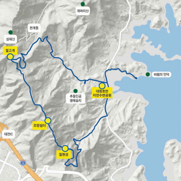 대청호반자연수변공원→추동임도→길치공원→질현성→조망쉼터→남도정→팔각정자→절고개→천개동 임도→대청호자연생태관→대청호반자연수변공원(추동습지보호구역)