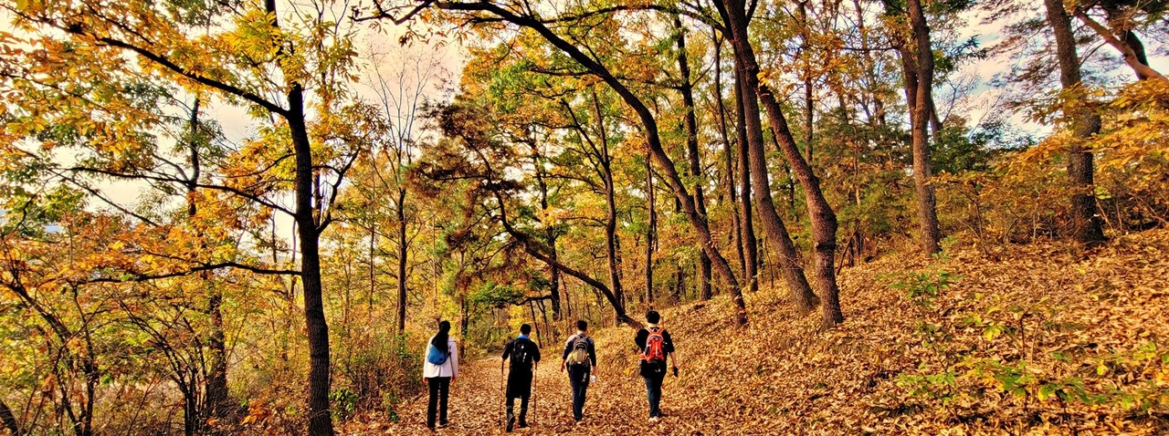 질현성 조망터에서 다시 1㎞ 지점, 또 한 번 좋은 전망을 만난다. 발걸음이 저절로 멈춰진다. 호흡을 가다듬고 다시 전진, 도시 소음은 줄어들고 지저귀는 새들의 소리는 선명해진다. 빨갛게 물든 단풍나무는 산을 모두 태워버릴 듯 강렬한 색을 발산한다. 숲속 나무들은 저마다의 DNA로 각기 다른 가을 색을 뽐내며 대비를 이루지만 자연의 품 안에선 모두 조화를 이룬다. 도시의 소음도 마찬가지다. 귓가에선 성가시게 울려퍼지지만 대자연 안에선 지극히 작은 삶의 한 부분일 뿐이다.
