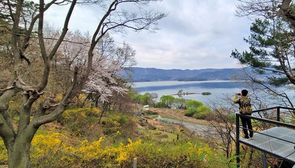 되돌아오는 길, 다시 충암 김정 선생 묘역과 마주하게 되는데 이 주변에 새롭게 숲길이 생겼다. 길로 접어들자 도로의 엔진 소음에서 벗어난다. 울창한 소나무숲, 이곳은 또 다른 세상이다. 벚꽃에 사로잡혀 화려해졌던 머릿속이 금세 차분해진다. 숲내음이 강하게 밀려들어온다. 수변 전망대와 덱길도 조성됐다. 대청호 트레킹의 진정한 묘미가 이제야 상기된다. 벚꽃에 취했다가 깬 느낌이랄까? 멀찌감치서 바라보는 오동선 벚꽃길의 또 다른 매력도 발견하게 된다. 대청호와 자연스럽게 어우러지니 금상첨화다.