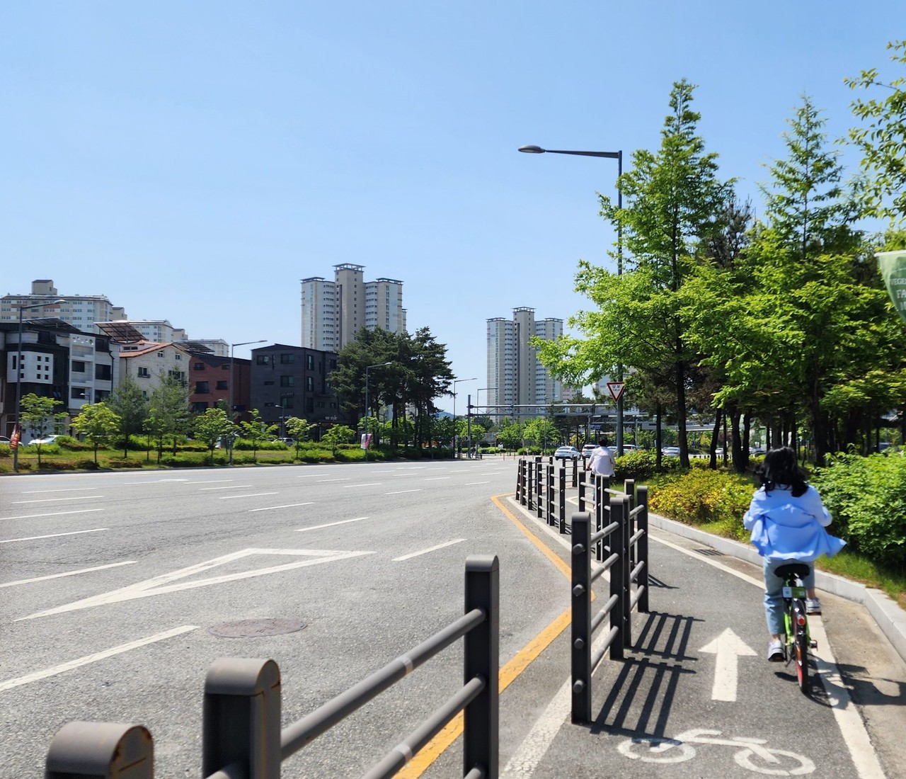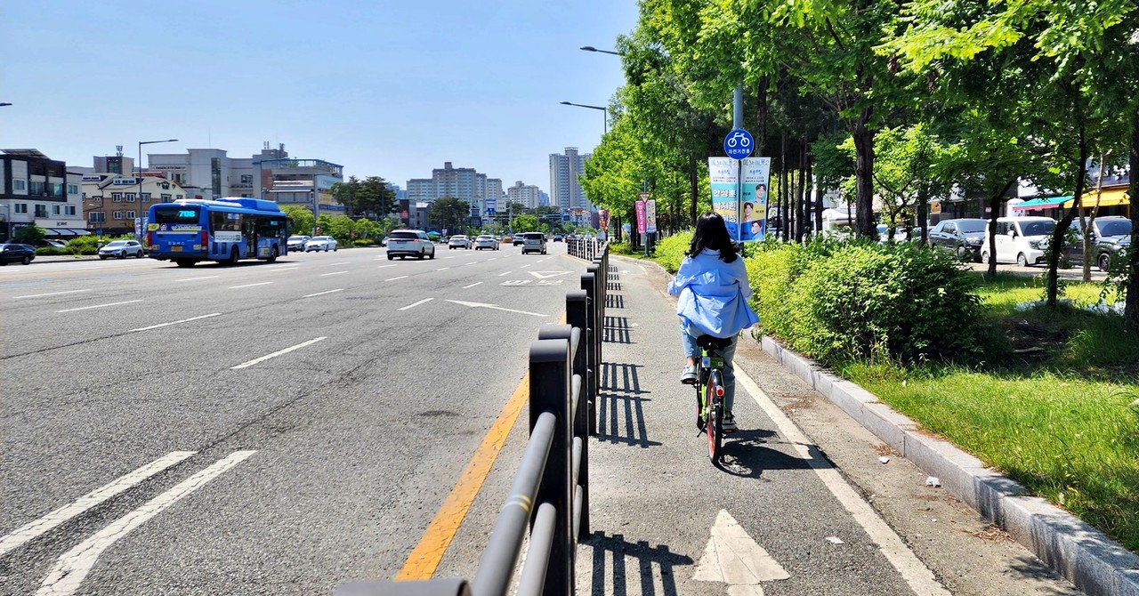 맑은 하늘과 우거진 초록잎을 모자삼아 페달을 밟기 시작했다. 자전거전용도로를 달린다. 유성네거리(유성온천역)에는 충대정문오거리부터 자전거전용도로가 이어져있다. 인도 위의 자전거도로가 아니다. 도로다이어트를 통해 차도 가장자리를 할애해 만든 자전거전용도로다. 차도와 보행자도로가 분리시설로 나뉜 전용도로 그 자체. 이 전용도로는 도안신도시로 쭉 이어진다. 사실 ‘자알못’인 필자의 시각에서는 달리는 자동차 옆에서 자전거를 타는 게 적응되지 않았다. 금방이라도 차량이 달려들 것 같은 불안감과 긴장감이 엄습했기 때문이다. 그러나 기우에 불과하다는 걸 깨닫기까지는 그리 오랜 시간이 걸리지 않았다.