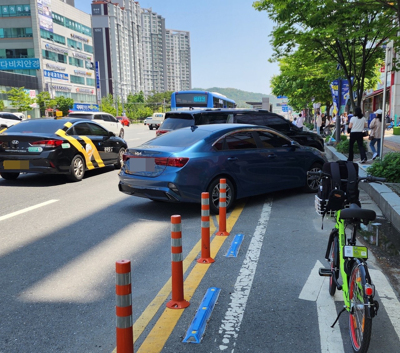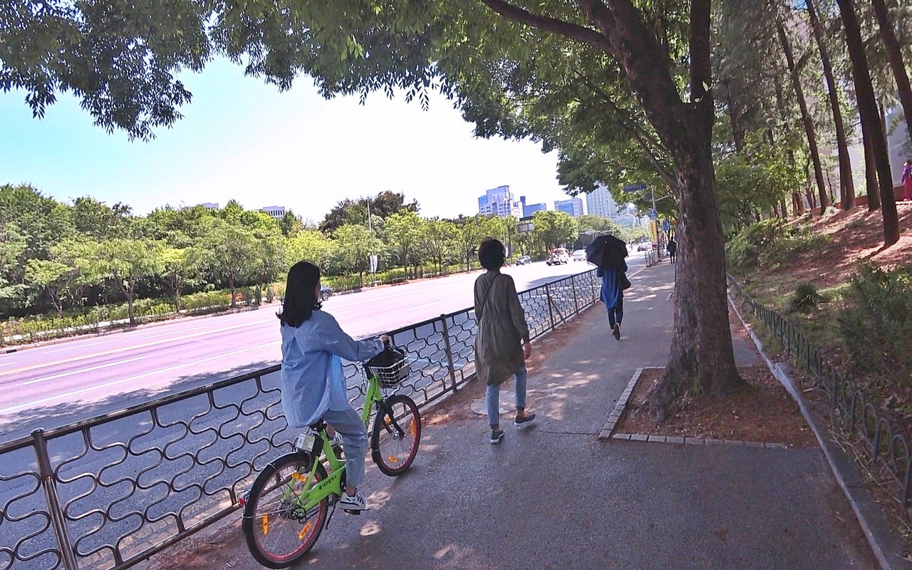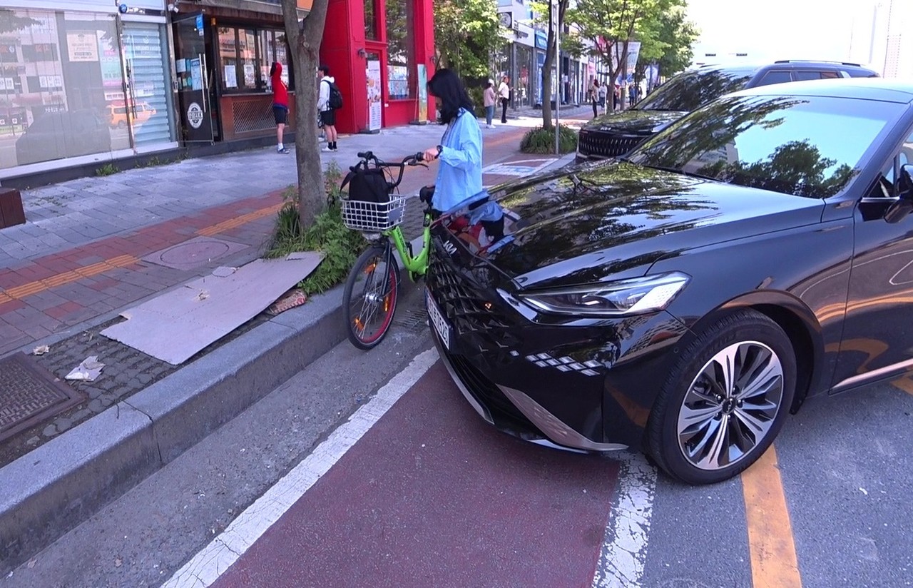 안타깝게도 자전거전용도로의 편안함은 찰나였다. 불법 주정차 차량이 등장했기 때문이다. 점심시간과 겹쳐 인근 상가에 있는 음식점과 카페로 향하고자 잠시 정차한 차량들이었다. 차량 대비 얇은 자전거의 폭만큼 자전거전용도로의 폭도 두 팔 간격 정도에 불과했는데 주정차 차량이 전면을 막아 다시 긴장감과 불편함이 엄습했다. 얄미운 불법 주정차 차량에 오기가 생겨 타슈에서 내리지 않고 중심을 잡으며 나아갔지만 계속 비틀거리는 데다 혹여 차량을 긁어 더 큰 참사를 유발할까 싶어 이내 안장에서 내렸다. 주정차된 차를 피해 자전거를 끌고 가면서도 뒤에서 달려오는 차들의 눈치를 살펴야했다.