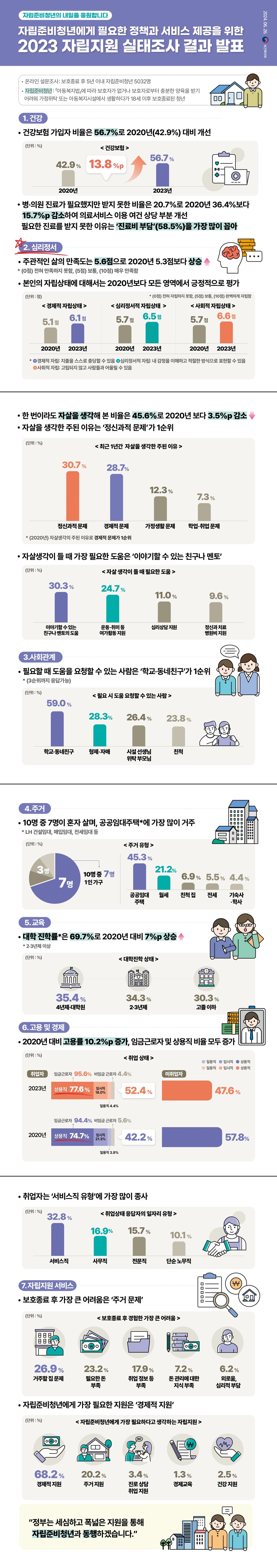 보건복지부는 26일 자립준비청년의 건강과 교육, 고용 등 자립실태와 지원 욕구를 조사한 ‘2023 자립지원 실태조사’ 결과를 발표했다. 실태조사에는 보호종료 5년 이내인 전체 자립준비청년 9670명 중 532명이 참여했다. 조사 결과 자립준비청년의 삶에 대한 만족도는 10점 만점에 5.6점이다. 정부 등이 이들에 대해 꾸준히 지원하고 관심을 표출해 지난 2020년(5.3점)보다 높아졌지만 전체 청년의 만족도(6.72점)에 비하면 여전히 낮은 수준이다. 자립준비청년의 건강보험 가입자 비율은 56.7%로 직전 조사인 2020년(42.9%)보다 13.8%포인트 증가했고 최근 2년간 건강검진 수검률은 53.4%로 2020년(47.1%)보다 늘었다. 지난해 기준 건강보험 직장가입자 비율은 42.6%로, 2020년(30.9%)보다 11.7%포인트나 늘어나, 자립준비청년의 고용·경제적 수준 개선이 반영된 결과로 보인다. 최근 1년간 병·의원 진료가 필요했지만 받지 못한 비율은 20.7%로 2020년(36.4%)보다 15.7%포인트 감소했다.